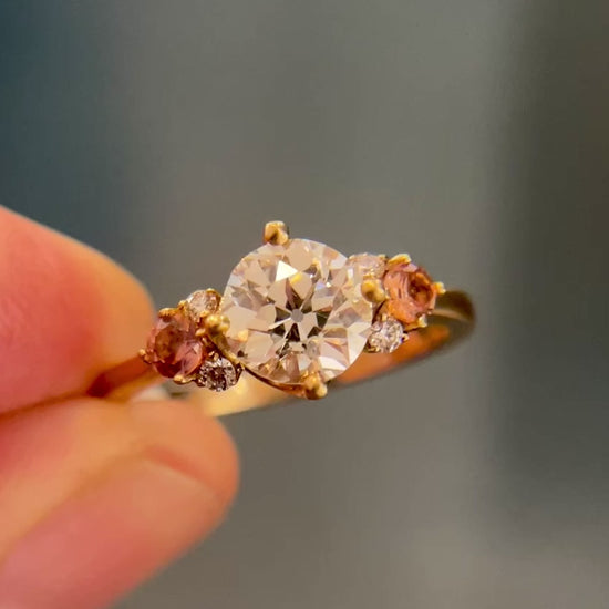 This sweet ballerina-slipper-of-a-ring featured a 1.13 Old European/Transitional diamond, two pink sapphires and four tiny diamonds. We'd be happy to source a new center diamond or work with one you provide.